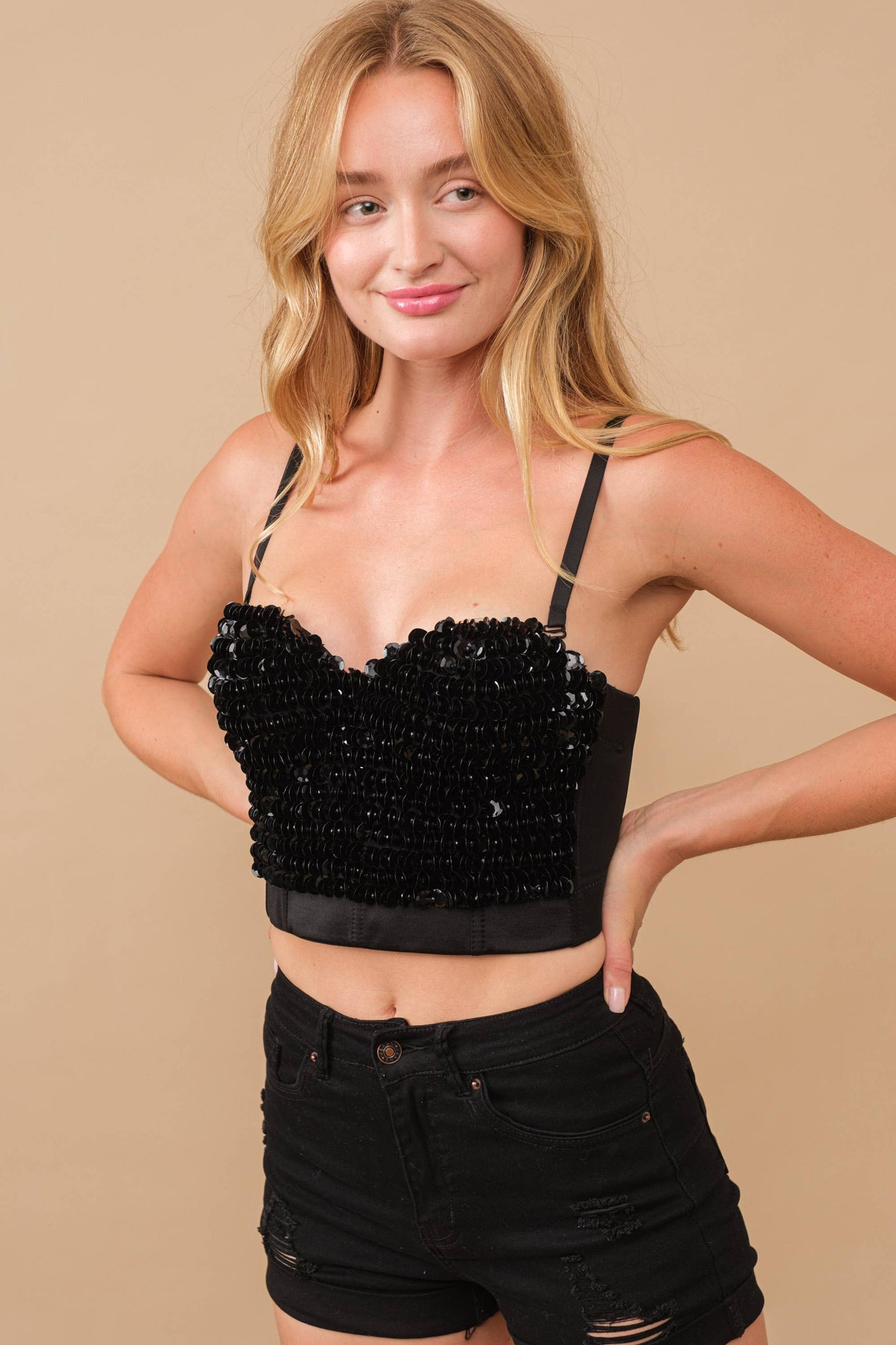61241T - Textured Bulky Sequin Corset Bustier Crop Bralette: BLACK